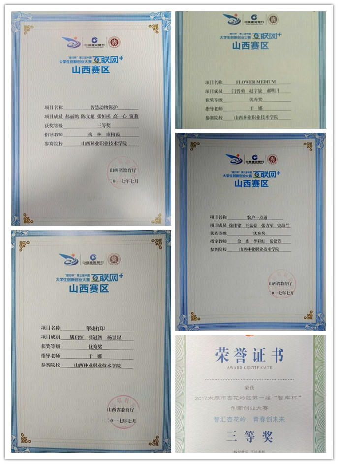 在第三届山西省“互联网+”大学生创新创业大赛中,我院林学系林业技术专业郝丽鹏、陈文超、张恒彬、高一心、贾莉5名同学的“智慧动物保护”项目荣获“三等奖”;园艺系绿色食品生产与检验专业徐佳铭、商品花卉专业史海兰等4名同学的“农户一点通”项目;园林系园林工程技术专业闫晋勇、赵宇旋、郝明月3名同学的“FLOWER MEDIUM”项目;园林系园林工程技术专业胡启恒、张冠智、杨昱星3名同学的“掣捷打印”项目分别荣获“优秀奖”。