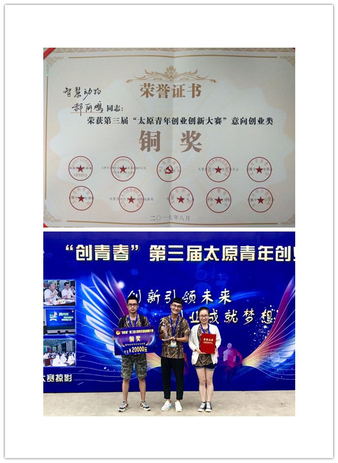 此外,郝丽鹏等同学的“智慧动物保护”项目在“2017太原市杏花岭区第一届‘智库杯’创新创业大赛”中荣获“三等奖”,并奖励500元现金。在“第三届太原青年创业创新大赛”荣获“三等奖”,并奖励20000元的大礼包。